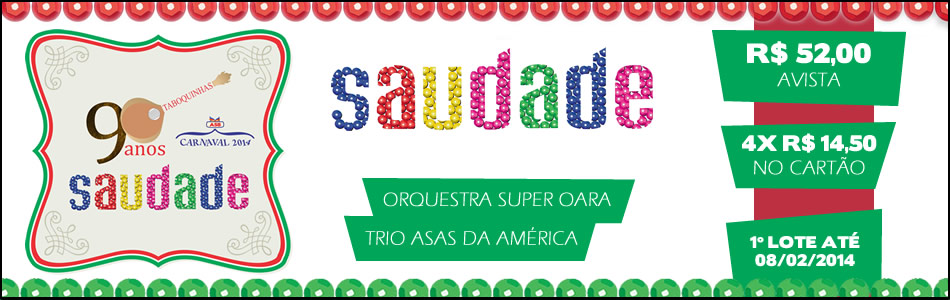 Sendo assim, quero lembrar aos carnavalescos da Vitória, em particular aos da SAUDADE, que os kits promocionais estão à venda até o dia 08 de fevereiro nos pontos de vendas- Posto Br Vitória, Escritório do Blog do Pilako e no Stand do Ingresso Vitória, no ponto localizado em frente aos Correios e com vendedores autorizados. Vamos juntos, cantar e homenagear o Clube de Fados Taboquinhas, verdadeira relíquia da República da Cachaça.