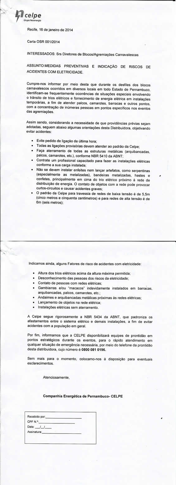 Recebemos na tarde da sexta (07) em nossa redação os senhores Wandson Felipe e João Pereira, ambos representantes da CELPE (Grupo Neoenergia). Na ocasião, recebi a carta OSR 001/2014, que trata de medidas preventivas e indicações de riscos de acidente com eletricidade.