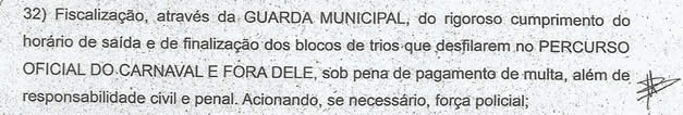 O curioso disso tudo é que segundo o TAC (termo de ajustamento de conduta) emitido para o carnaval 2014 quem tinha por obrigação de fiscalizar o horário de saída e finalização do desfile  das agremiações,  no percurso oficial do carnaval,  era a GUARDA MUNICIPAL. Confira o texto abaixo.
