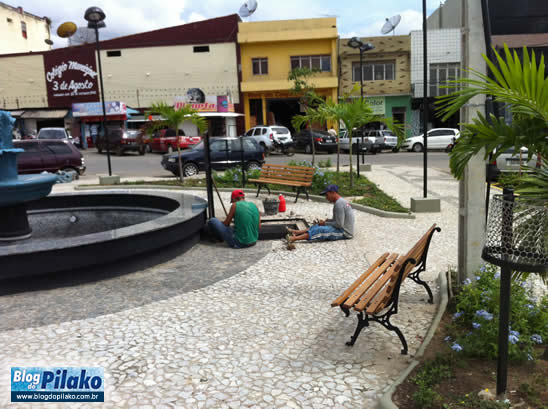 Pois bem, passado sete dias da referida postagem, hoje, segunda-feira dia 17, nossas lentes flagraram homens trabalhando próximo ao Tanque Ornamental da referida praça, certamente, para tentar consertar a “preaca” que foi feita.