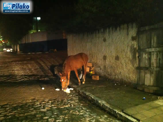 Na noite de ontem (08) nossas lentes flagraram, na Rua Horácio de Barros, por trás do Colégio Pedro Ribeiro localizado no bairro da Matriz, um cavalo se alimentando de lixo em plena via pública e promovendo a maior sujeira.