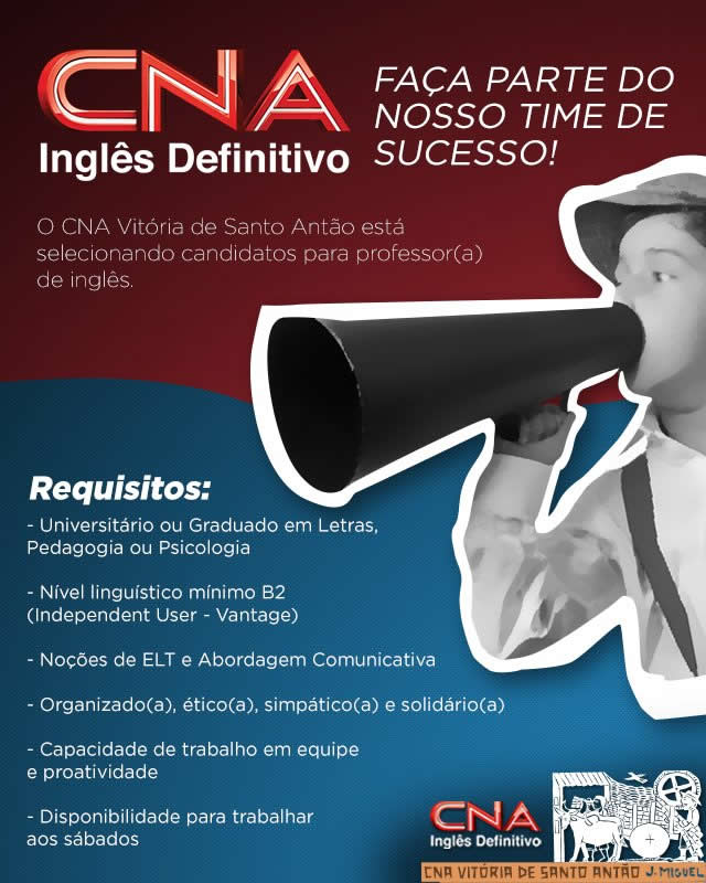 MOMENTO CNA VITÓRIA Publicado em 9 de maio de 2014 por Arquiles Petrus SERVIÇO: CNA Vitória Escola de idiomas Rua Silva Jardim, 257, 55612-400 Vitória de Santo Antão – PE 081 3526-4400 Atendimento 08:00 – 22:00
