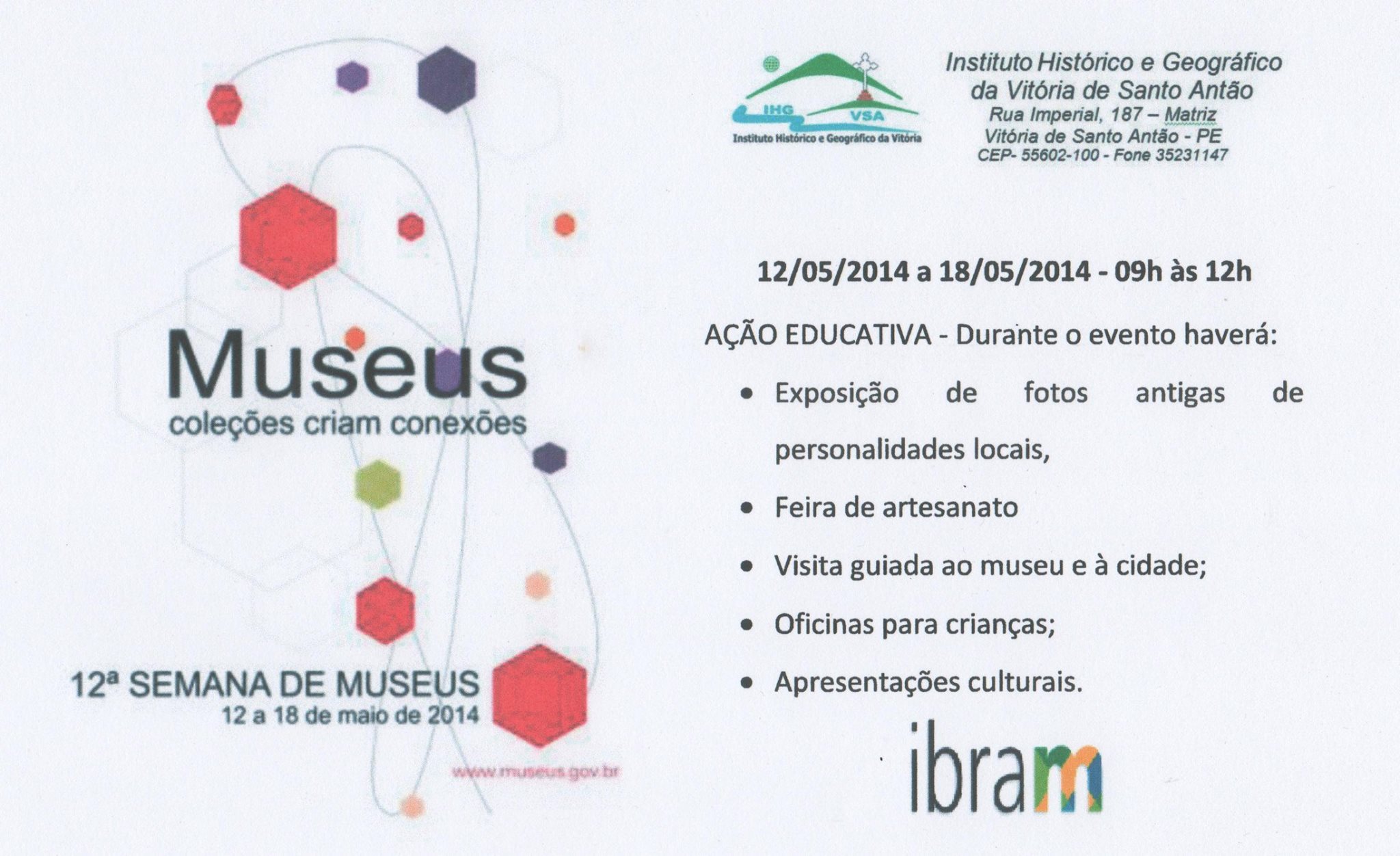 O Museu do Instituto Histórico e Geográfico de Vitória de Santo Antão participa este ano da 12ª Semana de Museus, evento de escala nacional promovido pelo IBRAM – Instituto Brasileiro de Museus. Nós que fazemos parte do IHGVSA contamos com sua presença para nos abrilhantar durante este evento.