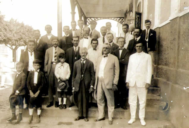 Registro, de passagem, que, na oportunidade da constituição e da fundação do Banco, foi tirada uma fotografia de alguns fundadores, na Praça Leão Coroado, empertigados nos degraus da escadinha que dá acesso à entrada da estação ferroviária da empresa inglesa de transportes, então denominada Great Westrn of Brazil Railway. Nessa fotografia, que o meu caro e dileto amigo Dr. Edson Lins possui, encontram-se mau pai e meu irmão José, falecidos. Também nela estou, de calças curtas e com a cabeça inteiramente rapada por causa de uma rebelde infestação de piolhos. Foi essa a única vez que me deixaram assim, com um crânio de aspecto mongoloide. Para meu desprazer, esse humilhante evento depilatório ficou assim fotograficamente provado “ad perpetuam rei memoriam”.