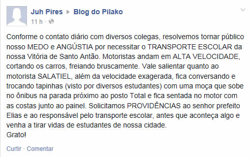 Internauta “Juh Pires” interage pelo facebook, reclamando de Transporte Escolar Publicado em 23 de maio de 2014 por Arquiles Petrus