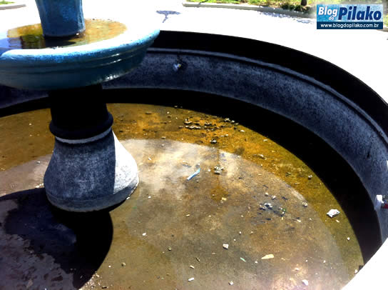 A fonte do seu tanque ornamental não funciona. A pouca água no tanque, cheia de lodo, começa a servir de hotel “5 estrelas” para o Aedes aegypti, popularmente conhecido pelo MOSQUITO DA DENGUE. É bom lembrar que foram investido na referida reforma desta praça  quase R$ 400.000,000 (quatrocentos mil reias) recentemente.