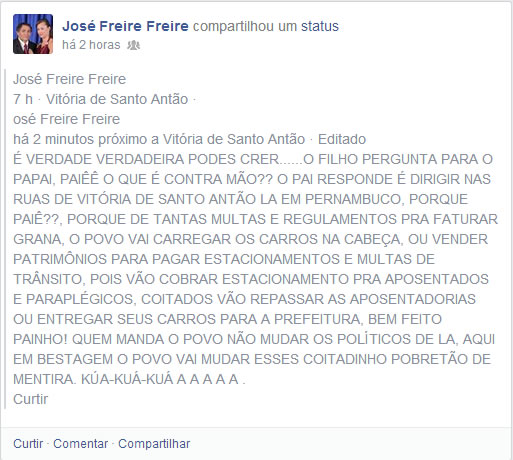 Internauta Maestro Freire interage pelo FACEBOOK Publicado em 13 de junho de 2014 por Arquiles Petrus