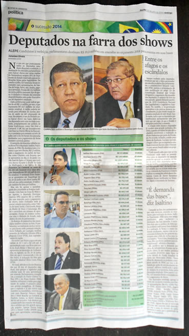 Com o título: DEPUTADOS NA FARRA DOS SHOWS, o mesmo jornal, no último domingo (20), na sua página 6 no caderno de Política, trouxe uma relação dos deputados, cuja a ordem, seguiu o critério dos que mais se utilizou de recursos públicos para promover shows e festas. Vale salientar que a fonte, segundo o Jornal do Commercio, foi o Diário Oficial do Executivo no intervalo de janeiro a julho.