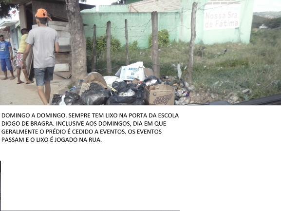 “NOTA ZERO A ESCOLA CAIQUE DIOGO DE BRAGA – NO QUE DIZ RESPEITO A SAÚDE PÚBLICA E LIXO NAS RUAS. ” – diz internauta João Fernando