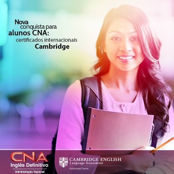 Atestando a qualidade no ensino de Inglês em suas escolas, o CNA passará a ser, a partir de janeiro de 2015, um Centro Autorizado para aplicação de exames do Departamento de Avaliação da Universidade de Cambridge, a mais antiga e mais conceituada do mundo na área, para seus alunos. Com isso, o exame de conclusão do curso de inglês para adultos do CNA passa a ser o FCE (Cambridge English: First), principal certificado oferecido pela tradicional instituição, como parte do curso e sem nenhum custo extra para os alunos. A parceria é mais uma forma de mostrar a qualidade e a seriedade no ensino de Inglês praticado pelo CNA. E vocês, alunos e professores do CNA, fazem parte disso!