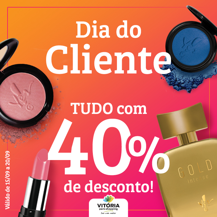 Promoção imperdível na Yes Cosmetics do Vitória Park Shopping! Aproveite a oferta de todos os produtos com 40% de desconto, de 15 a 20 de setembro. Esperamos por você!