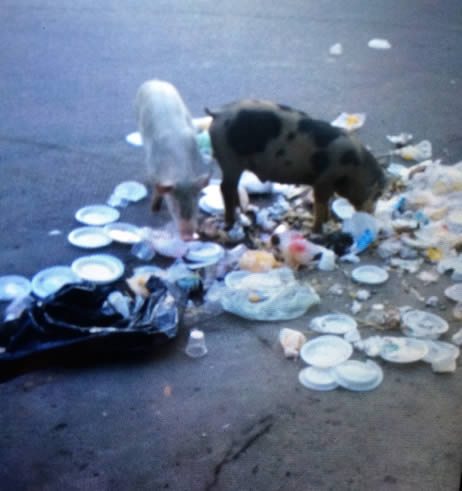 “pilako domingo pela manhã quando eu estava passeando com meu cachorro, os porcos estavam espalhando o lixo na rua do Rosário….isso é umm absurdo…..”