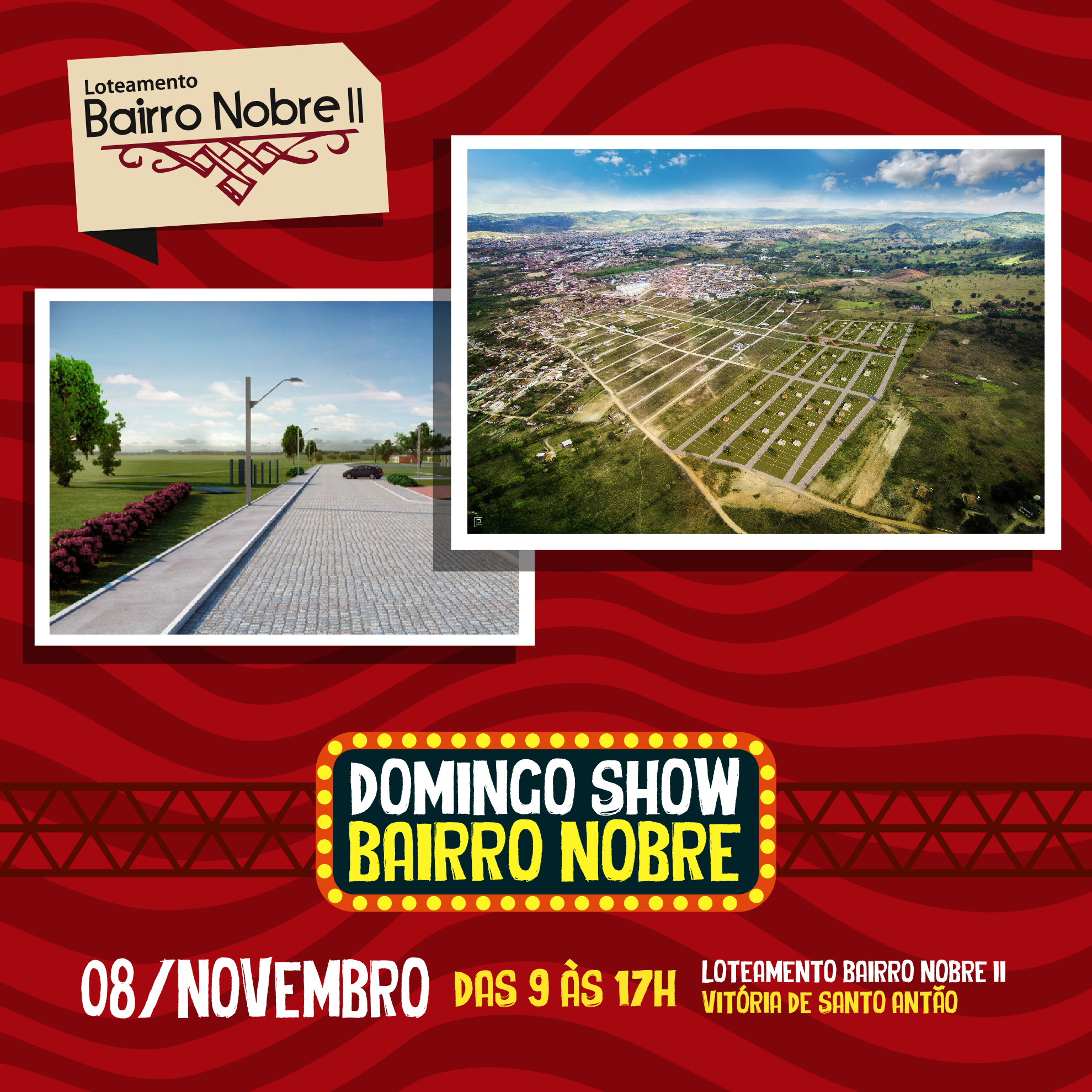 O Domingo Show acontece neste dia 08/11, das 9 às 17h e contará com ambientes exclusivos para clientes, shows musicais, recreação para crianças e outras atividades de lazer. Tudo isso em uma estrutura montada no terreno do loteamento.