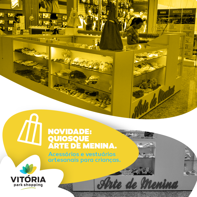 Momento Vitória Park Shopping Publicado em 9 de dezembro de 2015 por Arquiles Petrus Tem novidade aqui no Vitória Park Shopping. O quiosque Arte de Menina está cheio de fofuras artesanais para os pequenos. Venha conferir!
