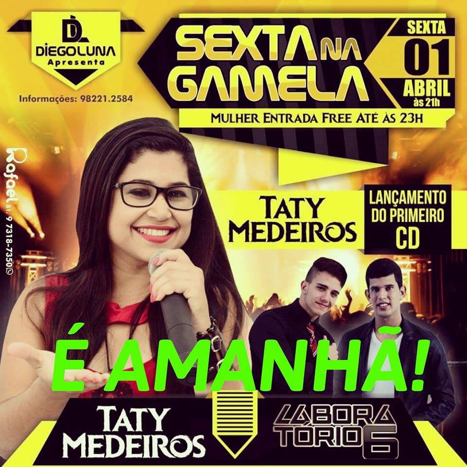 Sexta na Gamela Publicado em 31 de março de 2016 por Arquiles Petrus É AMANHÃ o lançamento do primeiro CD Oficial da cantora #TatyMedeiros conto com todos vocês, tudo começa às 23hs com a banda Laboratório 6. Mesas e Ingressos com #DiegoLuna! Info:98811-8631 Zap:98221-2584