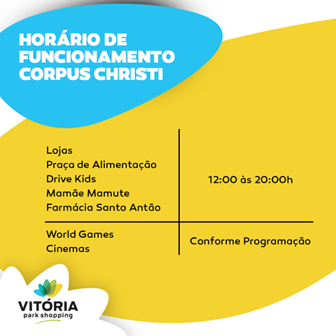 Momento Vitória Park Shopping Publicado em 25 de maio de 2016 por Arquiles Petrus Tá chegando um feriado por aí, hein? Confiram aqui 👇 o nosso horário de funcionamento: