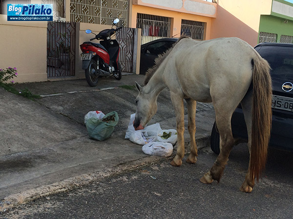 Na manhã de ontem (26) – mesmo no feriado de Corpus Christi – nossas lentes registraram, na Rua Jornalista Célio Meira, bairro do Cajá, um membro da equipe (ecológica) de equinos “contratada” pela prefeitura da Vitória – Governo de Todos – em pleno labor, ou seja: NA COLETA SELETIVA DO LIXO.