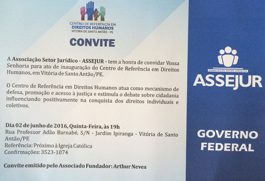 ASSEJUR: Inauguração. Publicado em 30 de maio de 2016 por Cristiano Pilako Registramos o convite da ASSEJUR para ato inaugural. Desde já, agradecemos o convite e desejamos sucesso.