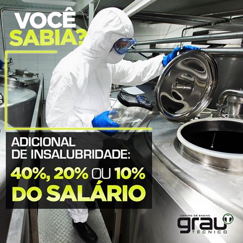 Atividades que exponham os funcionários a agentes nocivos à saúde devem ser remuneradas com acréscimo de 40%, 20% ou 10% do salário, de acordo com o grau de insalubridade. Fique Ligado! #GrauTecnico
