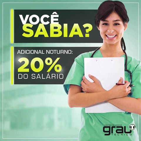 Alô galera do plantão: O trabalho realizado por qualquer profissional entre 22h e 5h do dia seguinte deve ser remunerado como acréscimo de 20% do salário. #GrauTecnico