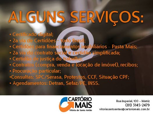 Momento Cartório Mais Publicado em 6 de outubro de 2016 por Arquiles Petrus Aqui na Cartório Mais Vitória de Santo Antão dispomos de vários serviços para dar agilidade aos seus negócios. Veja alguns dos mais de 300 serviços oferecidos. Estamos a sua disposição para atendê-lo.