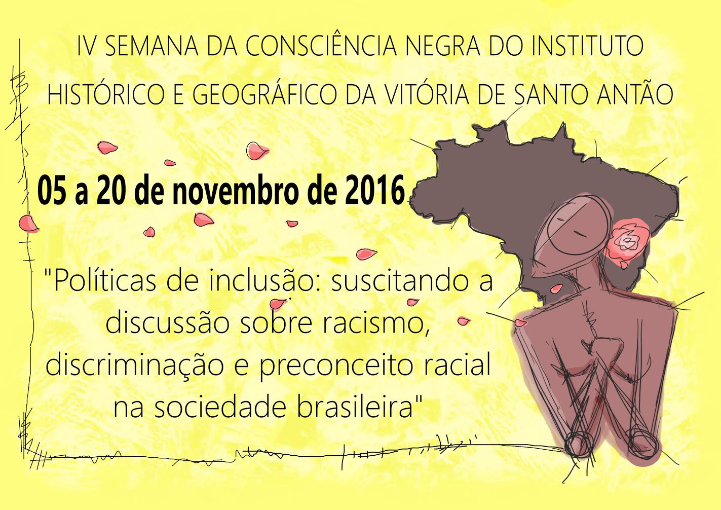 Há quatro anos, o Instituto Histórico vem desenvolvendo e realizando diversas ações em prol da Educação das Relações étnico-raciais. Ao longo desse tempo, buscamos trazer a problemática étnico-racial para o centro dos debates para depois desconstruí-la. E isso foi e está sendo importante. Durante este mês de novembro, realizaremos mesas redondas, lançamento de livros, shows, oficinas de teatro, penteados e capoeira. Ações em prol da promoção da diversidade étnica e cultural do nosso povo. Esperamos contar com a participação de todos/as, afinal a sua participação marca o seu envolvimento e comprometimento com o Instituto e com os eventos que ele promove.