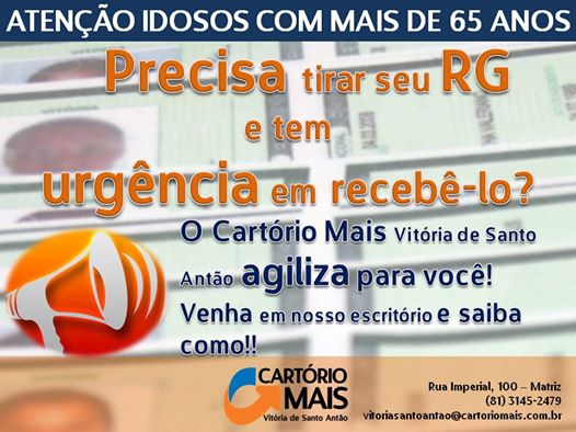 Momento Cartório Mais Publicado em 28 de outubro de 2016 por Arquiles Petrus IDOSOS COM MAIS DE 65 ANOS, QUE PRECISAM DA CARTEIRA DE IDENTIDADE, ATENÇÃO! Esta é sua OPORTUNIDADE!! Compareça ao Cartório Mais Vitória de Santo Antão, INFORME-SE e agende seu dia. AGILIZAMOS este serviço para você!!