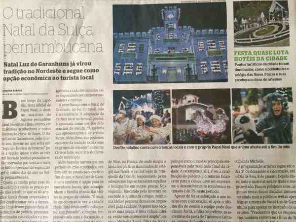 A matéria realça o clima vivenciado pela cidade, fincada na Região Agreste do nosso Estado. Em função da programação natalina promovida pela prefeitura, segundo o jornal, os 3.000 leitos de hotéis e pousadas estão sendo ocupados. Espera-se para o ciclo natalino algo em torno de 600 mil pessoas, até o dia 31 de dezembro.