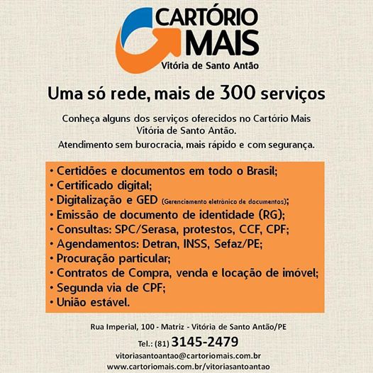 Momento Cartório Mais Publicado em 13 de janeiro de 2017 por Arquiles Petrus Dispomos de vários serviços para dar agilidade ao seu dia a dia. Confira alguns dos mais de 300 serviços oferecidos. Estamos a sua disposição.