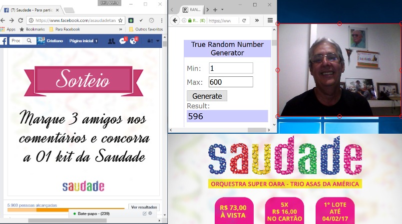 Conforme anunciado, hoje pela manhã, dia 20 de janeiro, realizamos o sorteio do kit da SAUDADE por uma LIVE, através da página oficial da SAUDADE, no facebook. De maneira transparente, objetiva e inédita (na cidade), segundo especialista da área, a promoção foi um sucesso.