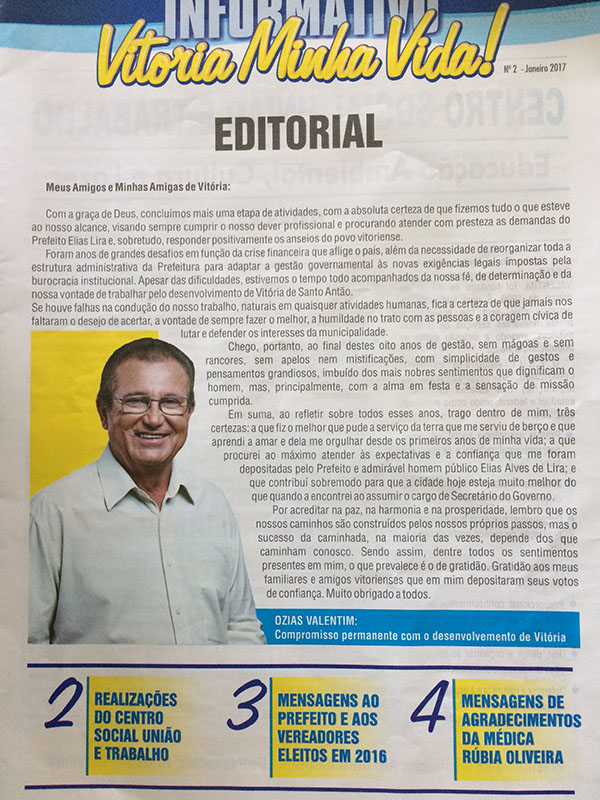 Recebi das mãos do amigo Ozias Valentim, dias atrás, um exemplar do jornal que vem sendo editado por ele e que se chama: Informativo – Vitória Minha Vida! Na ocasião, disse-me que pretende dá sequência nessa ferramenta de comunicação, uma vez que a primeira edição foi lançada na sua pré-campanha eleitoral para disputa majoritária municipal do ano passado (2016).