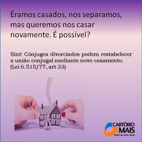 Momento Cartório Mais Publicado em 31 de janeiro de 2017 por Arquiles Petrus Você sabia? Art 33 – Se os cônjuges divorciados quiserem restabelecer a união conjugal só poderão fazê-lo mediante novo casamento.