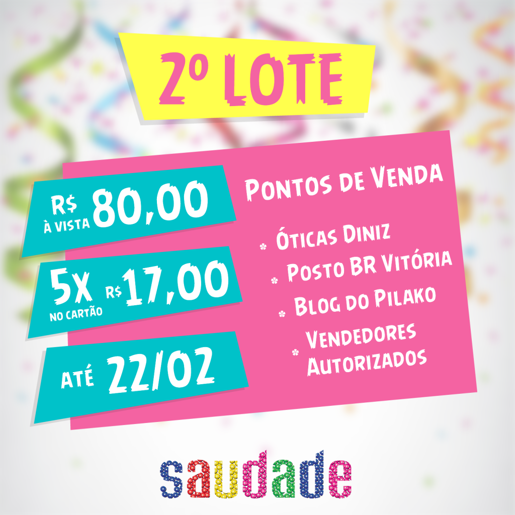 Anteontem, quarta-feira (08), através de uma LIVE, iniciamos o MEGA SORTEIO DA SAUDADE. Dessa vez, ao invés de um, estaremos sorteando quatro kits da SAUDADE. Para concorrer os internautas deverão postar na matéria da live, até o dia 21 de fevereiro, marcando três amigos. Automaticamente, caso o comentário seja o sorteados, os quatro serão contemplado. Mas tem uma condição: para ter direito ao prêmio os quatro deverão comparecer juntos, até o sábado de Zé Pereira (25), até as 17h, no local da nossa entrega de kit, ou seja: Rua Melo Verçosa, 567, Matriz.