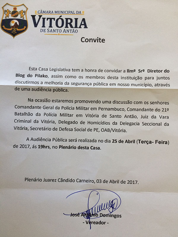 Registramos o recebimento do convite, emitido pela Câmara de Vereadores – para uma Audiência Pública que tem por objetivo “discutir a melhoria da segurança pública em nosso município”, proposta pelo comunicador e vereador Jota Domingos.