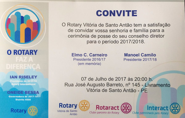 Registramos o convite do Rotary Vitória de Santo Antão para cerimônia de posse do seu conselho diretor para o período 2017/2018. Na ocasião o amigo Manoel Camilo assumirá o cargo de presidente. O evento acontecerá na noite da sexta (07), na sede da instituição – bairro do Livramento.