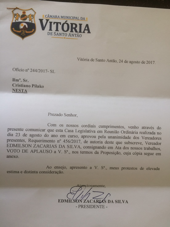 Foi com alegria que recebi, recentemente, o oficio (244/2017) enviado pela Câmara Municipal da nossa Vitória de Santo Antão. Nele, consta um VOTO DE APLAUSO na direção da minha pessoa, face ao recente lançamento do segundo volume do Livro Apelidos Vitorienses, ocorrido no dia 18 de agosto no espaço para eventos do Vitória Park Shopping.