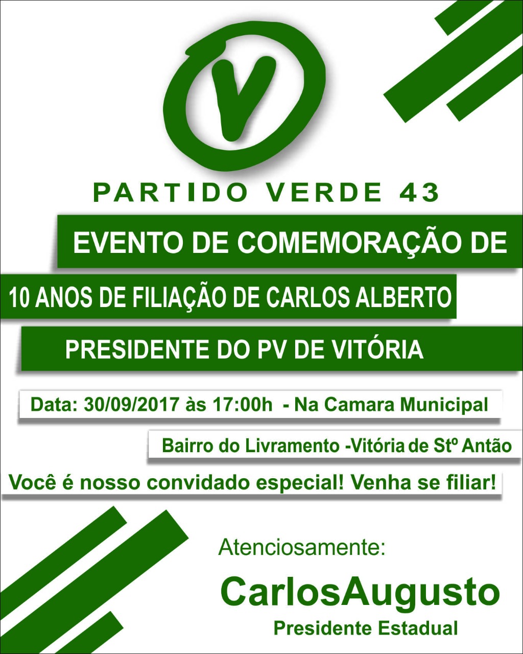 A direção do Partido Verde de Pernambuco promove amanhã, sábado (30), na Câmara de Vereadores da Vitória um evento festivo para comemorar os dez anos de filiação do atual presidente da sigla, em nosso município.