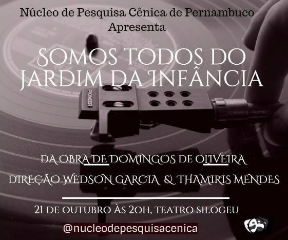 Com o intuito de movimentar a cena teatral local e representar a nossa Vitória de Santo Antão nos mais diversos eventos dedicados às artes cênicas no Nordeste, nasce o espetáculo: Somos Todos do Jardim da Infância. Com dramaturgia do carioca Domingos de Oliveira, direção de Wedson Garcia & Thamiris Mendes e Coreografias e preparação corporal de Cleiton Santiago. Essa é a segunda montagem do Núcleo de Pesquisa Cênica de Pernambuco que vem da encenação do espetáculo para infância e juventude “A menina que buscava o sol”, que esteve em cartaz durante dois anos em várias cidades pernambucanas, tendo recebido 23 prêmios nesses 24 meses de atividade. Esse novo projeto é a segunda etapa do trabalho de pesquisa continuada, realizada pelo grupo desde 2014, ano de sua fundação.
