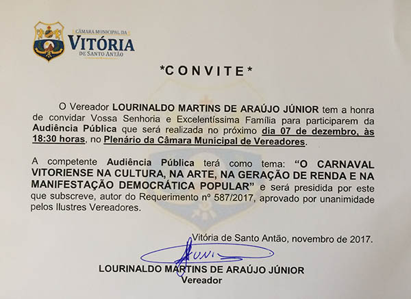 Registramos o recebimento do convite para “Audiência Pública”, enviado pelo vereador Lourinaldo Junior, que tem como objetivo debater e discutir “O CARNAVAL VITORIENSE NA CULTURA, NA ARTE, NA GERAÇÃO DE RENDA E NA MANISFESTAÇÃO DEMOCRÁTICA POPULAR”.