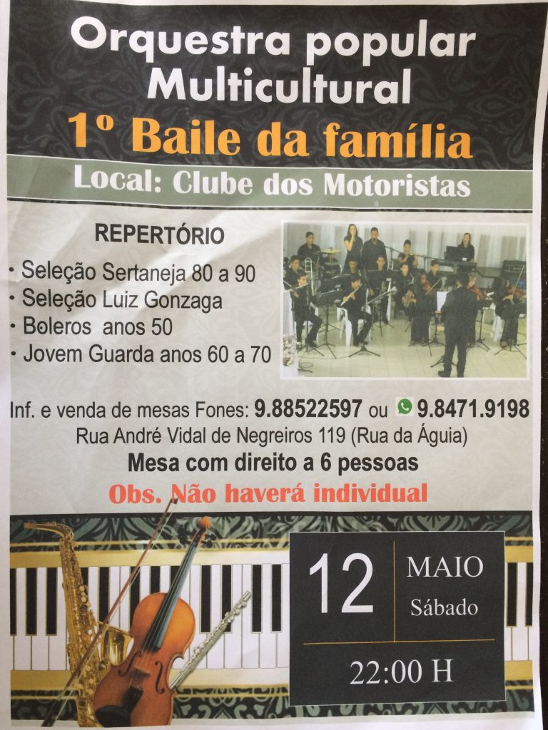Na organização do 1ª Baile da Família, que será realizado no Clube dos Motoristas, no dia 12 de maio (22h), encontra-se o amigo Maestro Freire. Com repertório variado, desde o sertanejo dos anos 80 ao bolero, passado por clássicos de Luiz Gonzaga e da jovem guarda a Orquestra Popular Multicultural será a atração da festa. As “mesas” poderão ser adquiridas pelos fones 9.8852.2597 e 9.8471.9198.