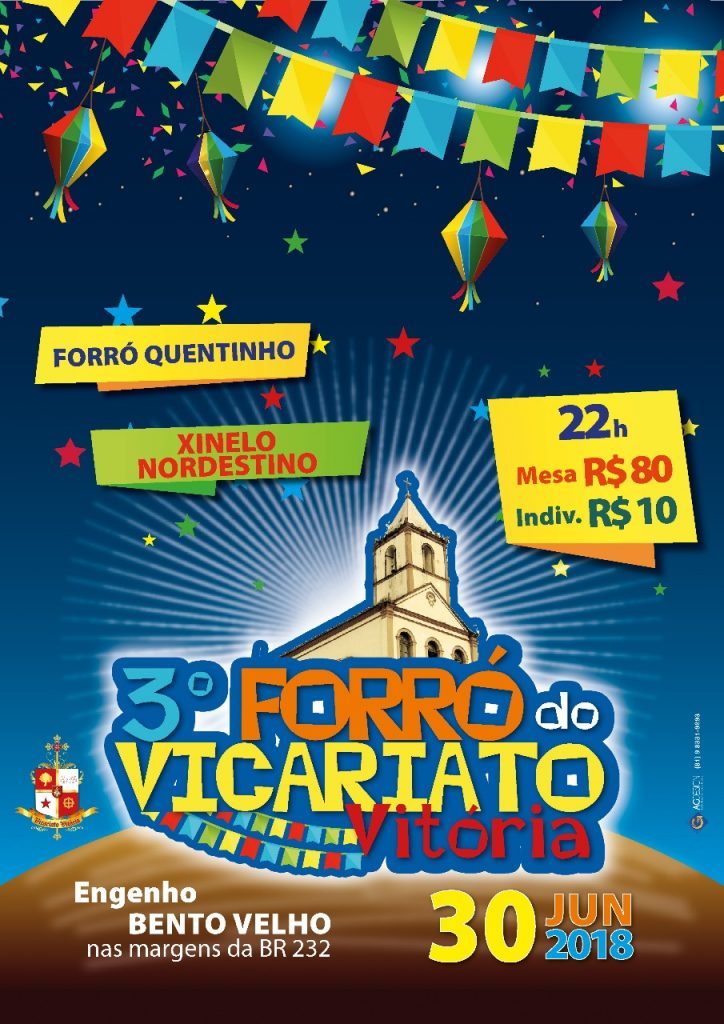 3º Forró do Vicariato Vitória: 30 de junho – Engenho Bento Velho. Publicado em 26 de junho de 2018 por Cristiano Pilako
