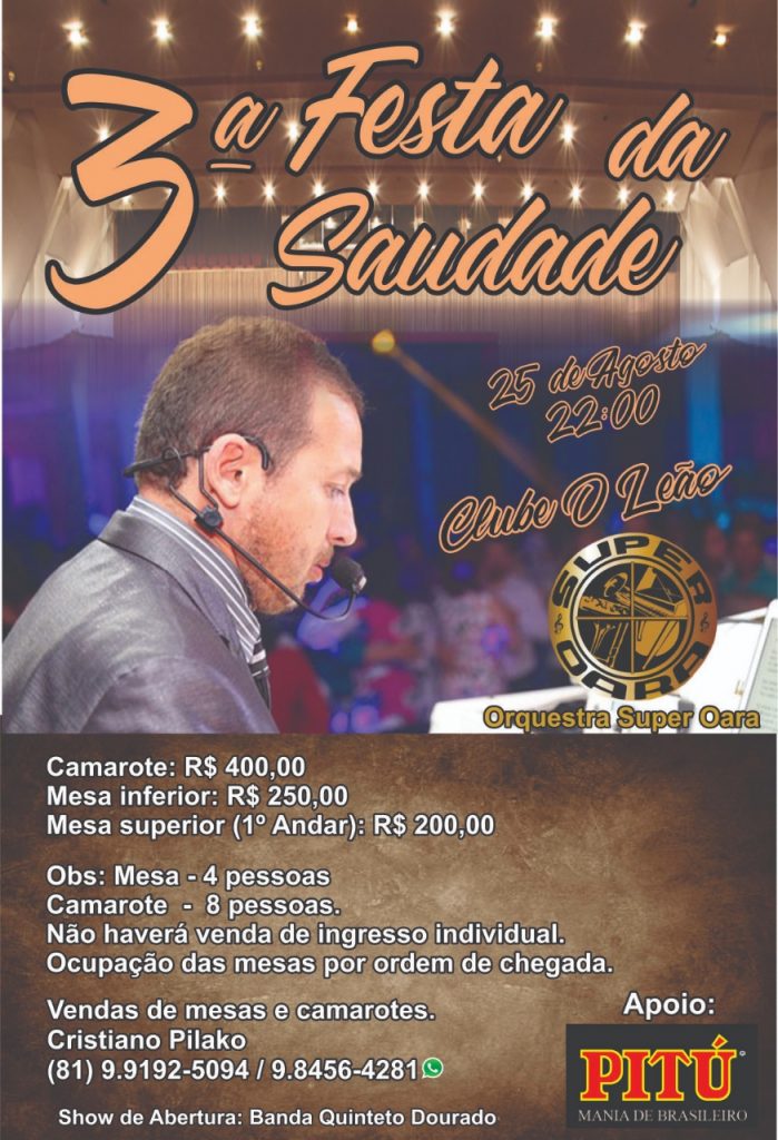 3ª Festa da Saudade – Super Oara – 25 de agosto – Clube ” O Leão”. Publicado em 18 de julho de 2018 por Cristiano Pilako