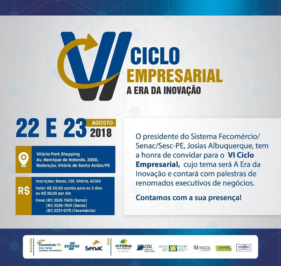 O Vitória Park Shopping juntamente com o presidente do Sistema Fecormércio/Senac/Sesc-PE, Josias Albuquerque, tem a honra de convidar para o Vl Ciclo Empresarial, cujo tema será: A era da Inovação e contará com palestras de renomados executivos de negócios.