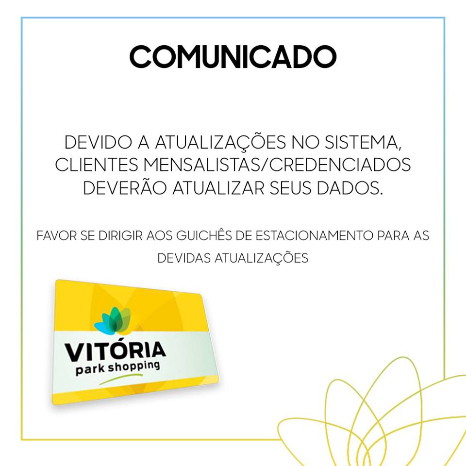 Momento Vitória Park Shopping Publicado em 26 de setembro de 2018 por Cristiano Pilako COMUNICADO! A não atualização dos dados poderá implicar problemas da leitura do cartão nas cancelas. Procure nossos colaboradores nos guichês de estacionamento.