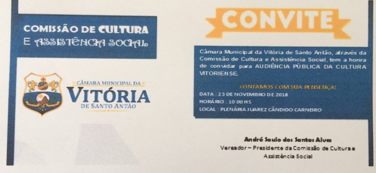 Registramos o convite,  enviado pelo vereador André Saulo dos Santos Alves – André de Bau – atinente à Audiência Pública da Cultura Vitoriense que será realizada no próximo dia 23, às 10h,  no Plenário da Câmara de Vereadores da Vitória. Agradecemos pela lembrança!