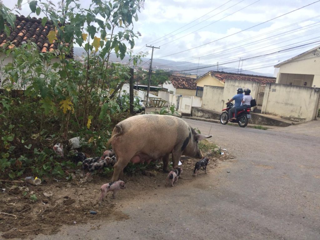 Na manhã de ontem (21), por exemplo, nossas lentes registraram uma “família de porcos” circulando pela Rua Jornalista Célio Meira, bairro do Cajá.
