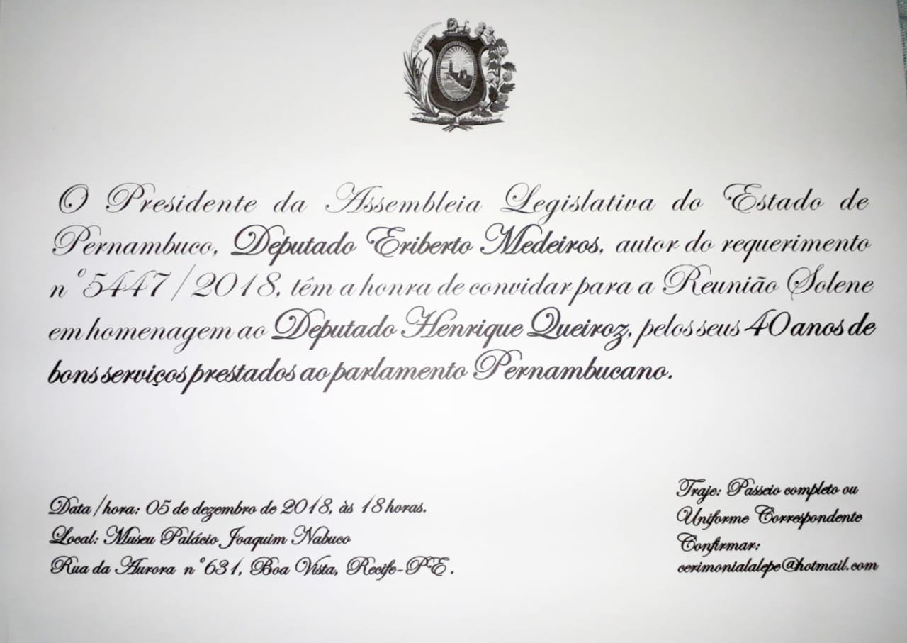 Registramos o recebimento do convite para a Reunião Solene em comemoração à passagem dos 40 anos de atividade parlamentar do deputado Henrique Queiroz. O autor do requerimento – 5447/2018 – partiu do deputado Eriberto Medeiros. O evento acontecerá na próxima quarta-feira, 05/12, às 18h, no Museu Palácio Joaquim Nabuco – Recife. Agradeço pelo envio do convite!!