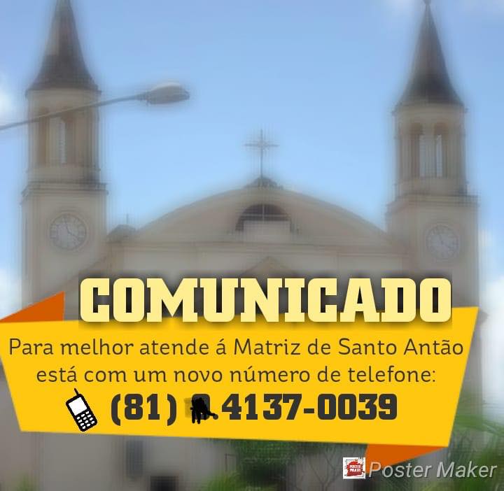 COMUNICADO: PARÓQUIA MATRIZ DE SANTO ANTÃO Publicado em 30 de novembro de 2018 por Cristiano Pilako A Paróquia Matriz de Santo Antão, está com um novo número para melhorar atender e informa aos paroquianos. ☎️ (81)4137-0039