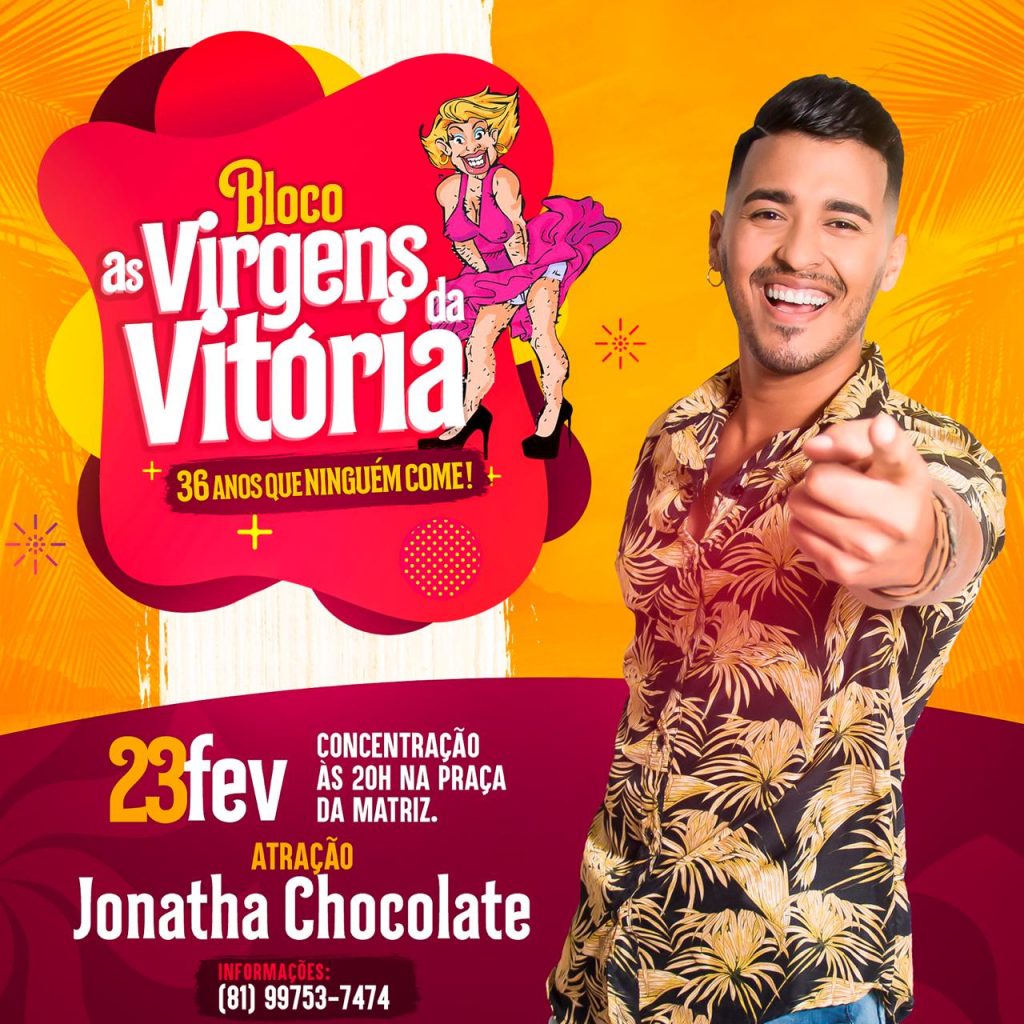 Sábado, 23/Fev, vamos soltar as frangas pelas principais ruas da Vitória curtindo o swing do JONATHA CHOCOLATE e ainda mais, com premiações que vão deixar vocês de boca aberta. São 36 anos que ninguém cooome e não vai ser dessa vez que vamos deixar, né? Adquira já o seu abadá ou crachá com os nossos revendedores autorizados.