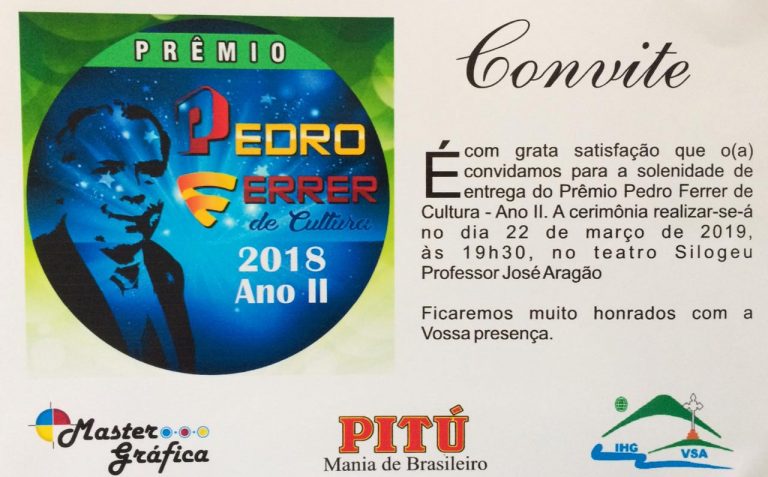 Cerimônia do 2º Prêmio Pedro Ferrer de Cultura é HOJE!!!! Publicado em 22 de março de 2019 por Cristiano Pilako